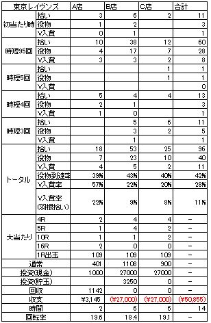 自力V入賞を味わえる藤商事:東京レイヴンズのV入賞率のまとめを紹介しておきます。