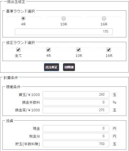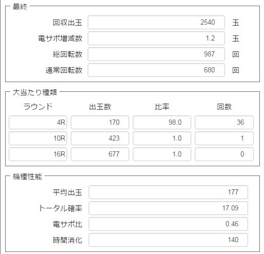 スルーがマイナス調整、電サポも少しマイナス調整で、電サポ+1.2玉/1回転でした。