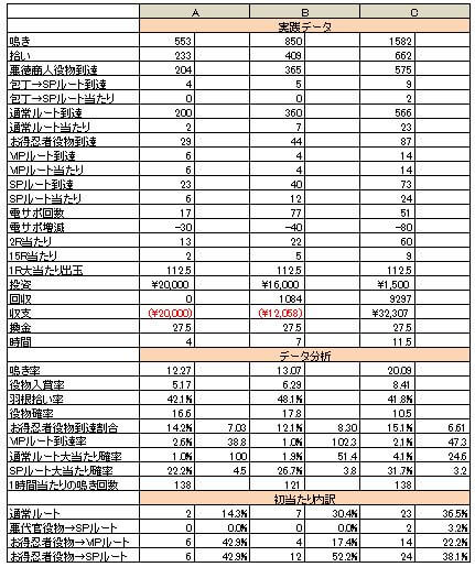 あわせて3日間の実践データを比較、役物確率別の等価ボーダーラインを書いてみました。
